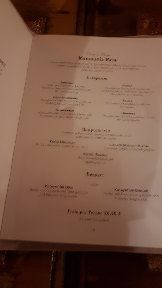 “ Wonderful Arabic restaurant. I have been here last year already and again I must say it is a highlight in Wuppertal. Very tasty, good prices, warm Cosy room and great service. We had for two persons, a bottle water, 25ml whine, a shot, 2 desserts, a separate starter and a mixed starter dish (of 10 variations). We were more than happy about the selection and completely full. Thanks for the nice dinner ”